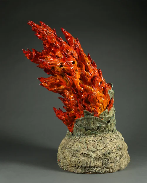 Things on Fire is motivated by the challenge of sculpting ephemeral form and by the exploration of vivid color, with cartoony and stylized results. While some pieces in the series keep this visual message central, others introduce the fire and a sense of peril to more familiar objects in our environments.