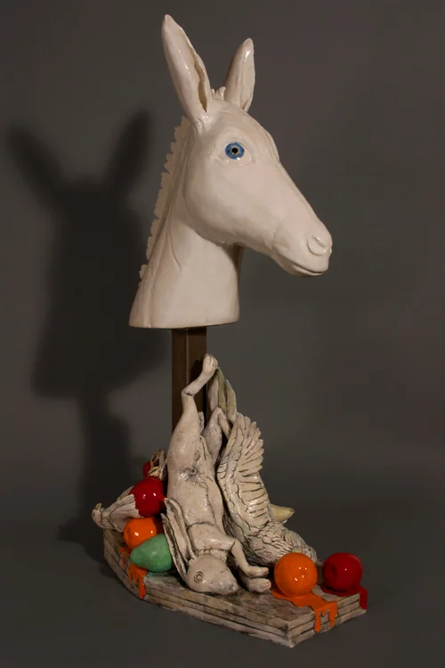 This body of work is inspired by the genre of still life painting (functioning traditionally as a reminder of mortality) particularly by the compositions of Chardin. Simplified but realistic representations of game animals are contrasted with cartoonishly glazed and artificially bright and vibrant elements (dripping oranges and apples, bright yellow canaries, flowing colors). The jarring compositions are meant to correlate with the complexity and strain of our attempt to understand mortality in its entirety.